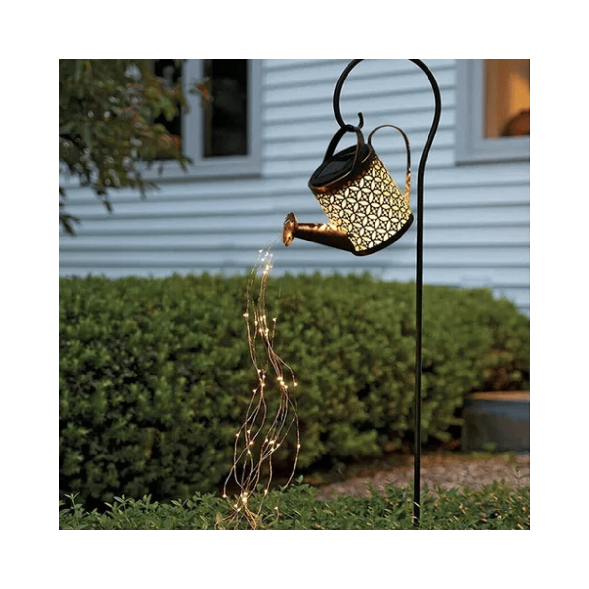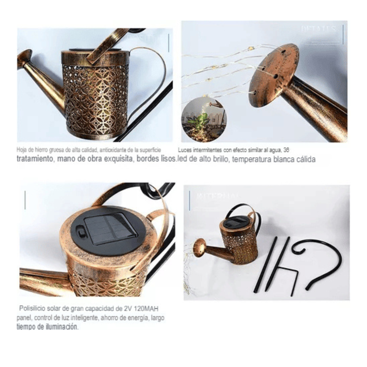 - Diseño Único: La regadera solar presenta un diseño de patrón hueco, creando una apariencia elegante que parece verter agua. Las luces de hilo de cobre que rodean la regadera añaden un toque de cuento de hadas a tu espacio exterior.