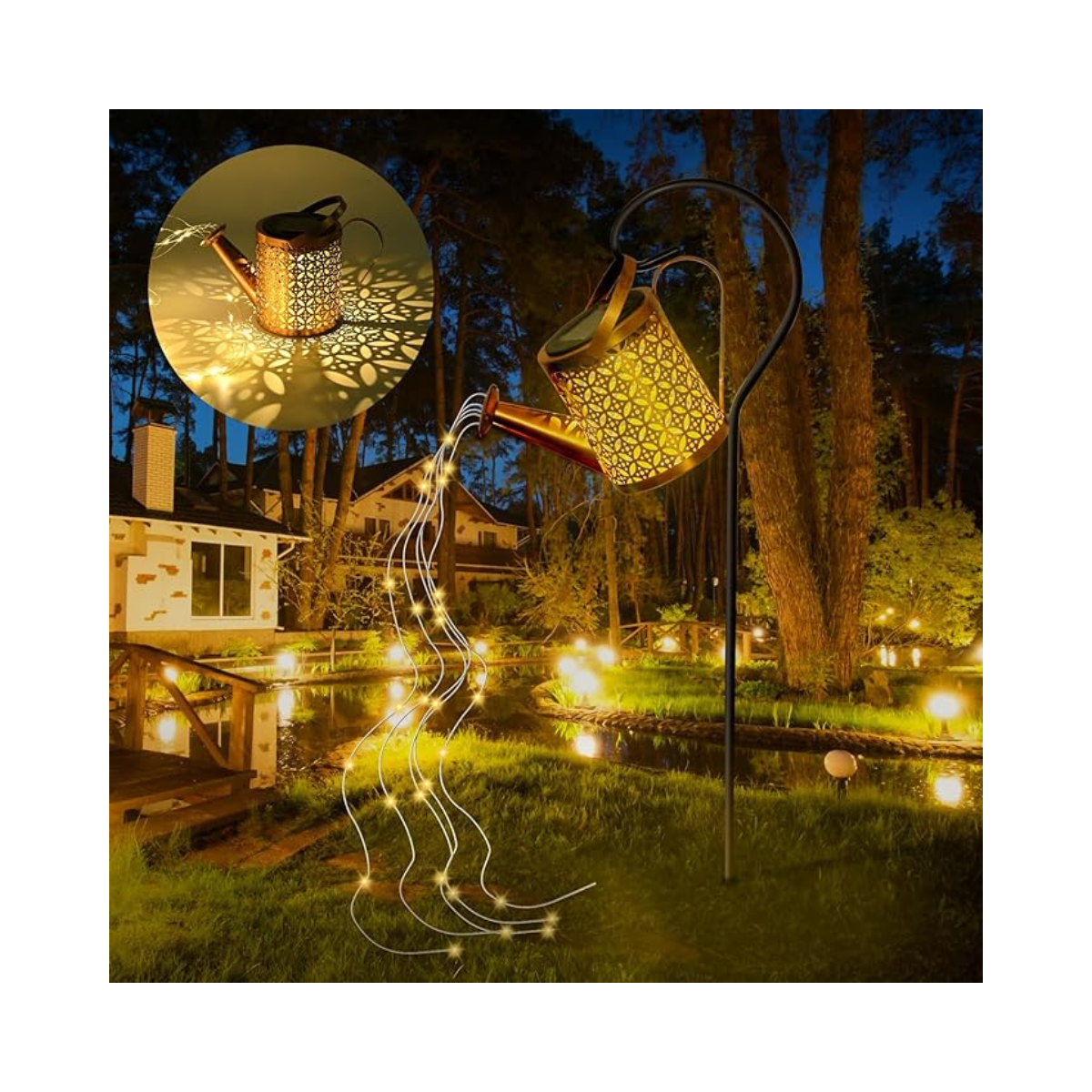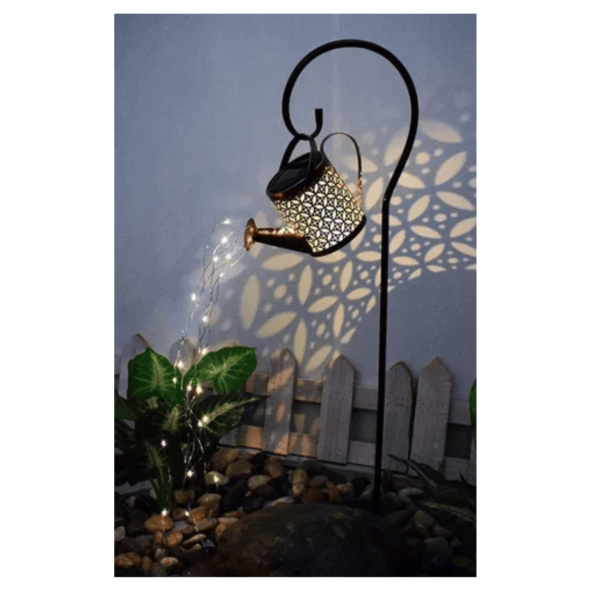 Este encantador adorno no solo ilumina tu jardín con una luz suave y mágica, sino que también agrega un toque de elegancia con su diseño único, en forma de regadera. Descubre cómo la brisa acaricia las luces de hilo de cobre, creando una experiencia mágica en tu propio rincón de naturaleza.